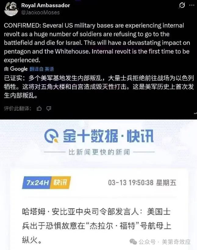 美军的消耗肉眼可见:防空弹药库存快速告急,所谓 “全球最严密” 的使馆区域,也频频被无人机突破,相关画面直接在网络流传。官方公布的伤亡数字还只是13人,但前线的真实处境,大兵们自己清楚。以至于美军越战之后第一次发生基地哗变,甚至自伤拒绝上前线的情况。